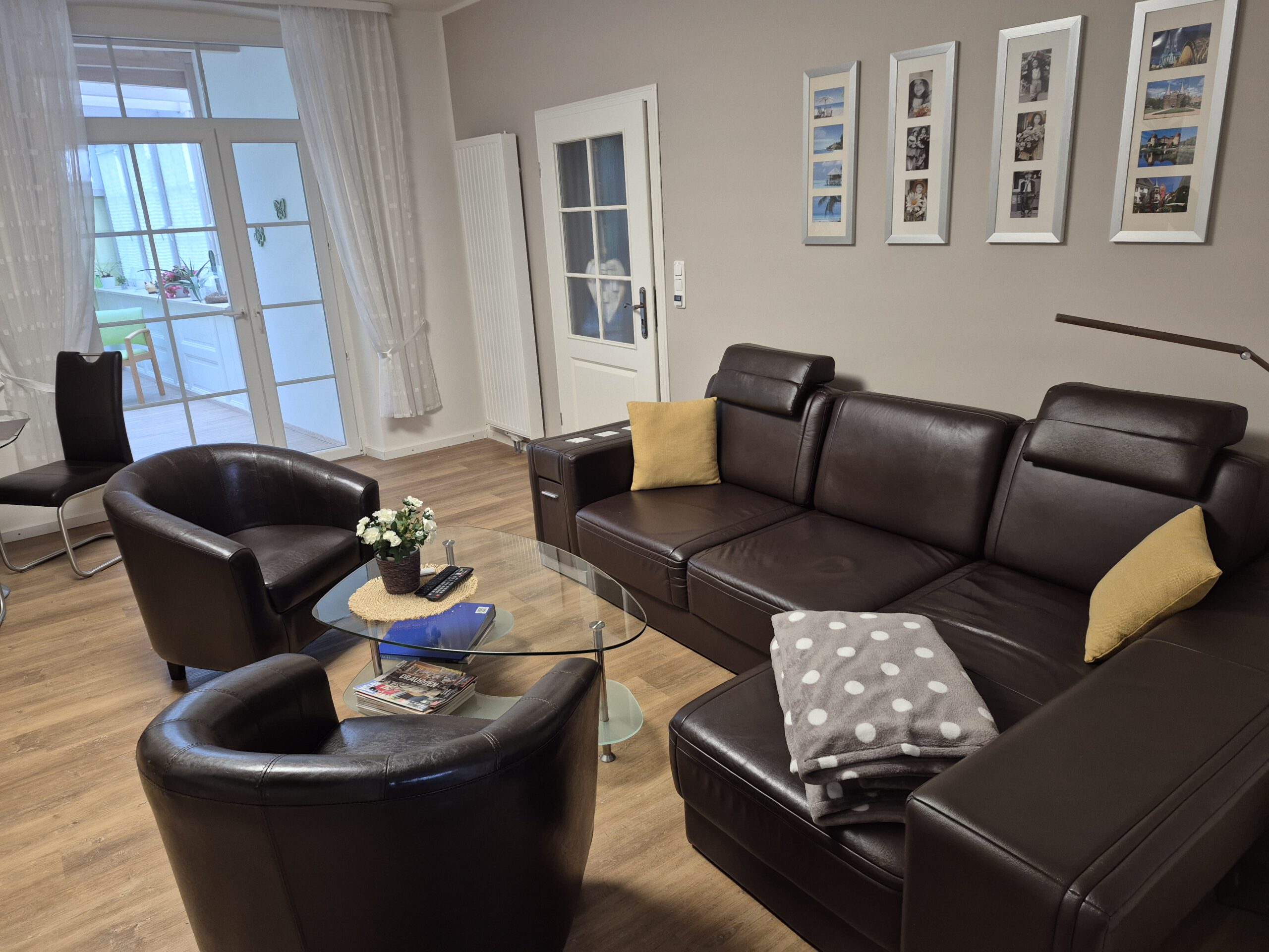 Ihre Urlaubsunterkunft liegt in einem bis 2023 kernsanierten Wohnhaus und umfasst ein Wohn-/Esszimmer mit sich anschließenden Wintergarten, eine Küche mit integrierter Küchenzeile, eine kleine Terrasse mit Tisch und zwei Stühlen ist vor der Küche vorhanden, ein Schlafzimmer mit einem Doppelbett 1,80 x 2,00 (Matratze mittelhart und Topper 10 cm fest) und Hängemöglichkeiten für Ihre Bekleidung und einem Schminktisch/Laptoptisch, im Schlafzimmer sind elektrische Rollladen vorhanden, ein Badezimmer mit bodentiefer Dusche und Waschtisch, mit Handtuchheizung und Fön. In der Küche befindet sich eine Küchenzeile mit Herd und Cerankochfeld, eine Abzugshaube, ein Geschirrspüler, Kühl-Gefrierkombination, Toaster, Wasserkocher, Kaffeemaschine, sowie eine kleine Waschmaschine.